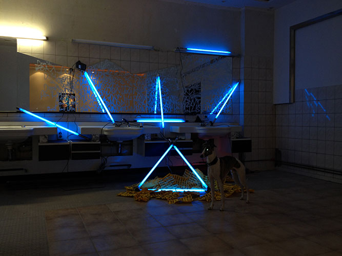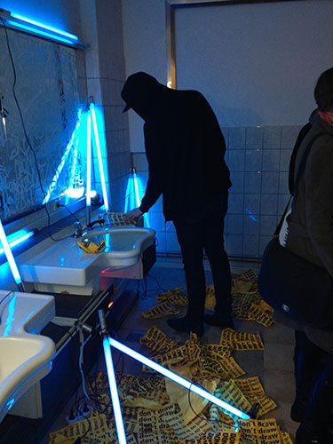 Performance mit einem Wächter, der angewiesen wurde, das Publikum für zwei Stunden zu ignorieren und als Aufgabe hatte das Waschbecken immer randvoll zu halten und Die Zettel auf den "don't draw!" zu zerknüllen.